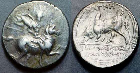 | Sear 4476 | Magnesia ad Maeander, Ionia. AR Tridrachm. ca 350BC. Magistrate Kallianos, son of Kallikratos. Armed horseman prancing right with spear / MAΓNE KAΛΛIANAΣ KAΛΛIKΡATOY above and beneath bull butting left within meander, wheat ear behind. | Text | Image |
