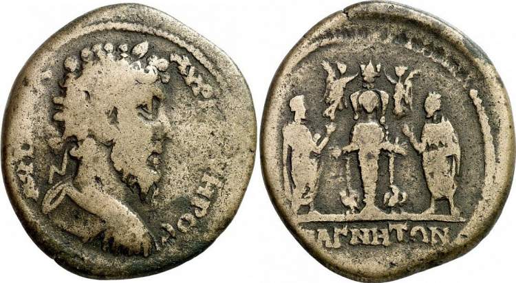 | RPC ol 11511 | Antoninus Pius, AE33 of Magnesia ad Maeandrum, Ionia. Struck AD 139-144. 26.53 g. Magistrate Dioskourides Gratos Metro. T AIΛIOC KAICAΡ ANTΩNEINOC, laureate, draped and cuirassed bust right. / EΠI ΔIOCKOYΡIΔOY ΓΡ MHTΡ MAΓNHTΩN around bearded male figure seated left on throne covered with a lionskin, sword at his side, holding shield inscribed ..H..ANOC on column. RPC IV temp 11511. Unpublished in current literature. | Text | Image |