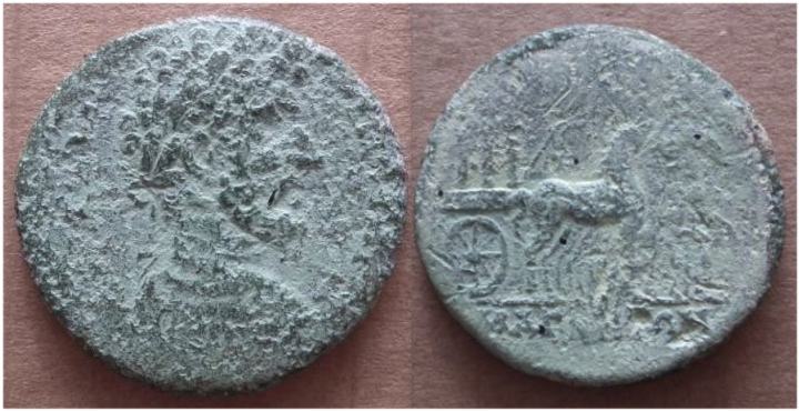 | Schultz 132 | Lucius_Verus, AE35, Magnesia ad Maeandrum, Ionia. 161-169 AD. AV KAICAΡ Λ... - AV OVHΡOC, Laureate, cuirassed bust right / MAΓNH-TΩN, cart being drawn right by four horses. Schultz Magnesia 132. | Text | Image |