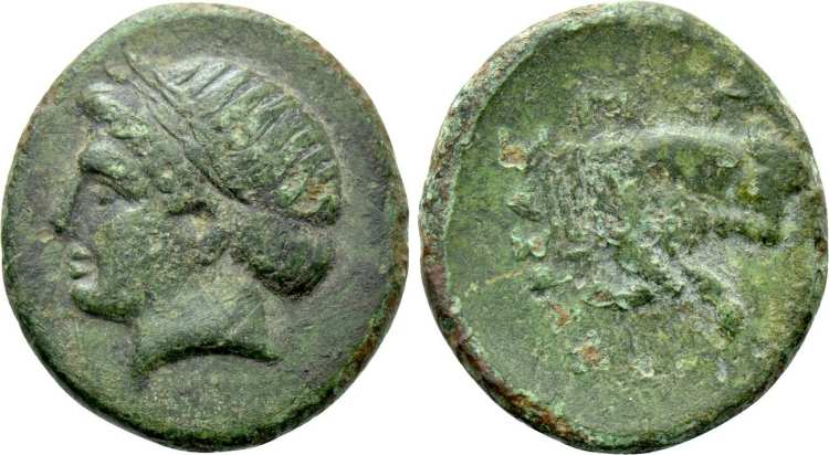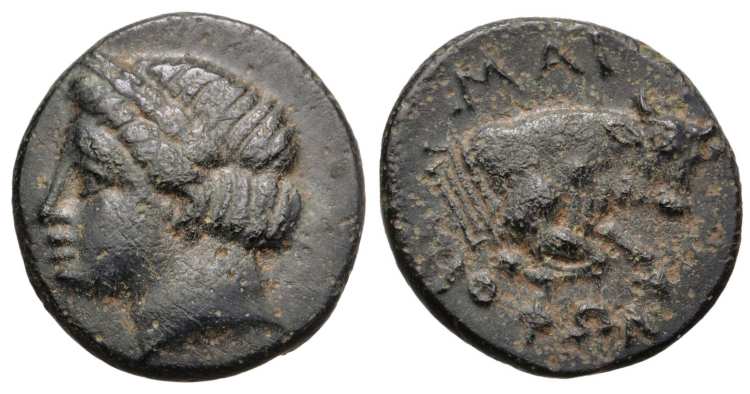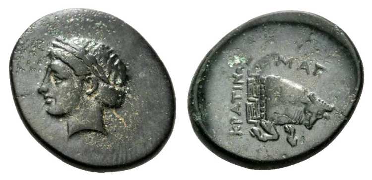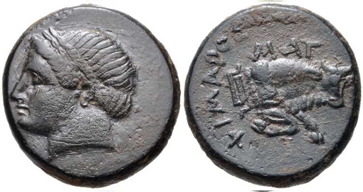 | SNG Cop 804 | Magnesia, Ionia AE14. 350-200 BC. Magistrate Demetrios. Laureate head of Apollo left / MAΓ ΔHM-ETΡI-OΣ, forepart of bull rushing right, maeander pattern behind. | Text | ![]() |