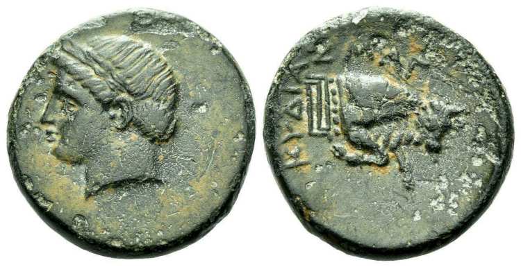| wwxls BC11825 | Magnesia ad Maeandrum, AE19, civic issue. 350-190 BC. 5.56 g. Magistrate Kydias. Laureate head of Apollo left. / MAΓ KYΔIAΣ above and to left of forepart of bull right with Maeander pattern at its body truncation. Unpublished magistrate for this type. wwxls 11825; Naville 91, 205. | Text | ![]() |