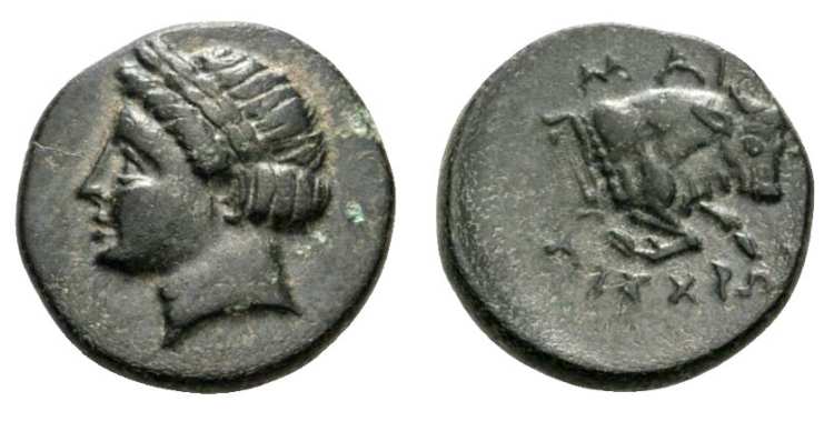 | wwxls BC11827 | Magnesia ad Maeandrum, AE13, civic issue. 350-190 BC. 1.1 g. Magistrate Aischron. Laureate head of Apollo left. / MAΓ AIΣXΡΩN above and beneath forepart of bull right with Maeander pattern at its body truncation. Unpublished magistrate. wwxls_11827; Roma 6, 167. | Text | ![]() |