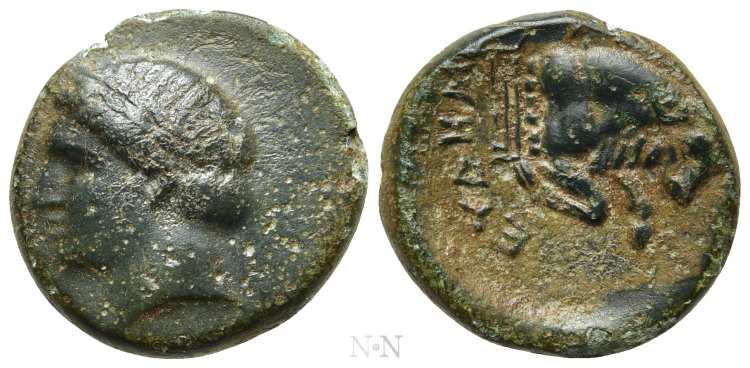 | SNG Fitz 4512 | Magnesia ad Maeandrum, Ionia, AE unit. 350-190 BC. Magistrate Kleandros. 19.06mm, 5.71 gr. Helmeted horseman prancing right, holding couched spear / MAΓN KΛEANΔΡOΣ above and beneath bull butting left, within meander border, corn-ear below. SNG Fitzwilliam 4512; Leake 3; Sear Greece 4487-4488 var (magistrate, corn-ear). | Text | ![]() |