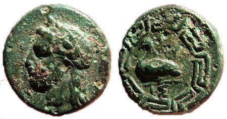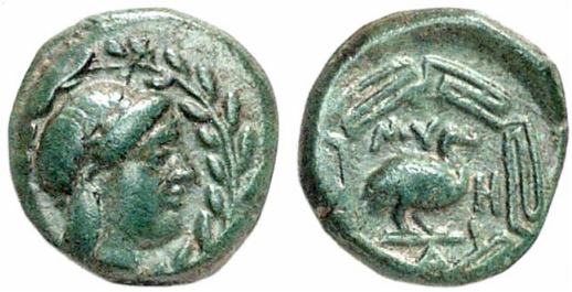 | Imhoof KM 2 | Myus, Ionia, 4th cent. BC, AE 17, 2.77g. Laureate head of Apollo right / MY, goose standing left within maeander pattern. Traite pl. CXLIX, 29; Imhoof-Blumer, KM 2. | Text | Image |