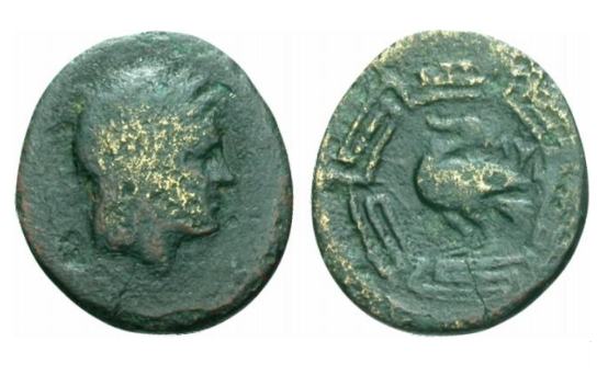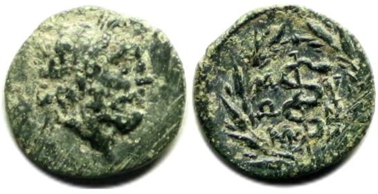 | Rohde 14106 | Myus, Ionia, AE16 mm, 2nd century BC. 2.10g. Head of Asklepios right / MYΩN across fields, serpent-entwined staff within wreath, monogram below. Unpublished. | Text | Image |