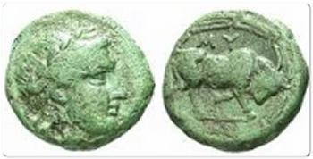 | MM 21, 632 | Myus, Ionia, 4th cent. BC, AE 10. Laureate head of Apollo right / MY, bull butting right on ground line within maeander pattern. | Text | Image |