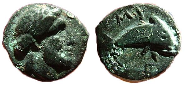 | SNGCop 1022 | Ionia, Myus, AE 11. 4th century BC. Laureate head of Zeus of Poseidon right / MY, dolphin right, trident below.