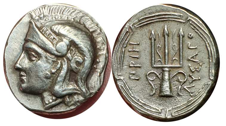 BMC 5 | Priene, Ionia, AR drachm. 290-250 BC. 3.58 g. Magistrate Lysago. Helmeted head of Athena left, wearing earring and necklace. / ΠΡIH-ΛYΣAΓO to left and right of trident head in Maeander pattern. BMC 5; Regling Priene 16-17; Bunbury 197; Mionnet Supp. III 891; Whittall II 436; SNG Davis 280. | Text | Image |