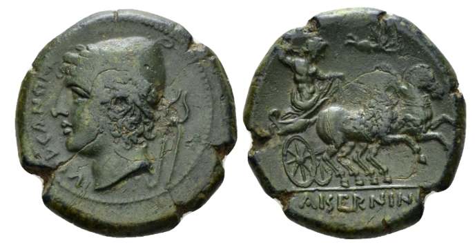 | HN Italy 430 | Aesernia, Samnium. 263-240 BC. AE 23. VOVERNON, Head of Vulkan left, wearing pilos, tongs to right. / AISERNINON beneath Jupiter in biga galloping right; Nike flying right above, crowning horses. HN Italy 430; SNG ANS 1118. | Text | Image |