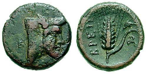 | HN Italy 2678 | Italy, Uncertain Issue. Circa 400-300 BC (?). AE 17mm. Head and neck of man-faced bull right; TΡAE above, K behind / BΡEII, grain-ear with leaf; dolphin at upper right, AB monogram at lower right. | Text | Image |