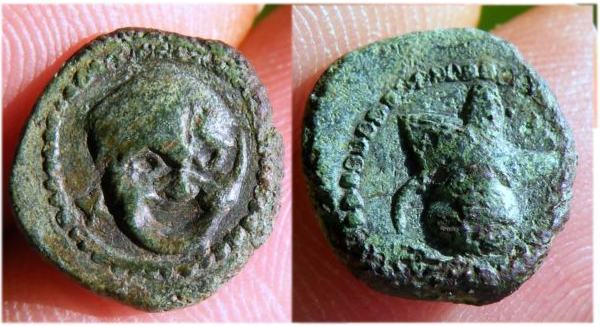 | Stannard Liri 100381 | Central Italy 1st c. BC. AE 13-14mm, 2.0 gr. Actor's laughing mask, value mark X to left / Aryballos (small flask), strigil and bath cloth (?). Stannard, Liri database 100.381 (this coin), otherwise unpublished. | Text | Image |