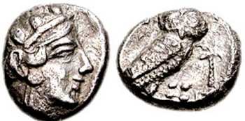 SNG ANS 15 | Gaza, Palestine. c. 4th c. BC. AR Obol.Head of Athena right/ Owl standing right, head facing; AOE and Mem, for Marnas, the chief god of Gaza. | Text | Image |