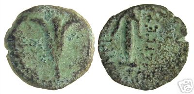 | | Hendin 459 | Kingdom of Judaea, John Hyrcanus I, AE Prutah. 135-104 BC. Archaic Hebrew text within wreath: Yehohanan the High Priest and Head of the Council of the Jews / Double cornucopia adorned with ribbons and pomegranate between. AJC 1 Group S.