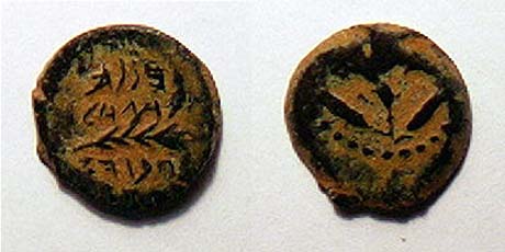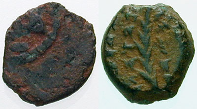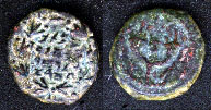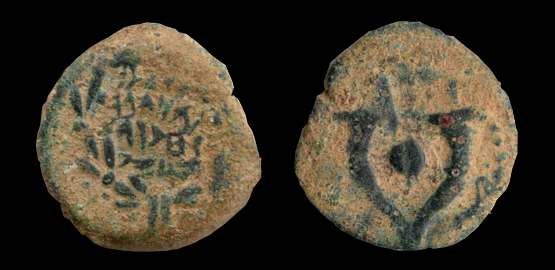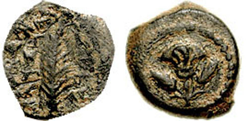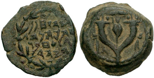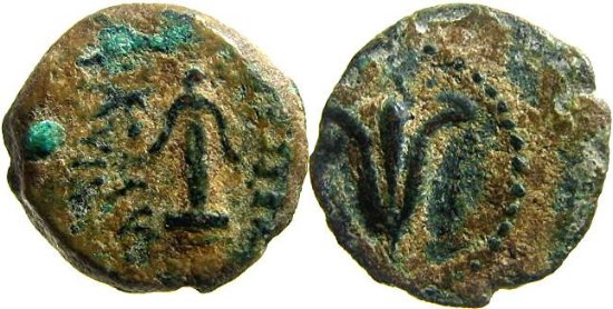 | Hendin 458 | Kingdom of Judaea, John Hyrcanus I (Yehohanan) AE Lepton. 134-104 BC. Palm branch flanked by four lines of archaic Hebrew (Yehohanan the High Priest and Council of the Jews) / Lily, monogram left. AJC I Group O.