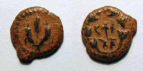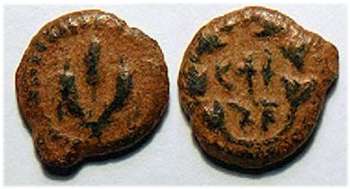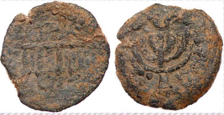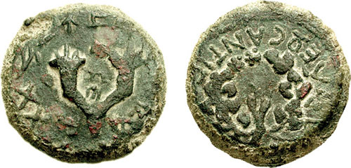 | Hendin 481 | Mattathias Antigonus (Mattatayah) AE 25 mm. Double cornucopiae with Hebrew (Mattatayah the High Priest and Council of the Jews), around and between horns / Ivy wreath tied at top with ribbons hanging down; inscription (of King Antigonus). Meshorer 36f.