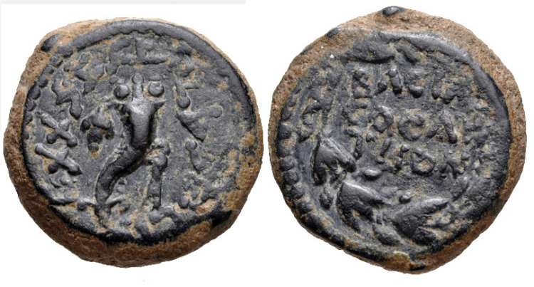 | Hendin 482 | Mattathias Antigonus (Mattatayah). 40-37 BC. AE 20 mm 4 Prutah, 7.76g. Single cornucopia tied with ribbons, vine leaf and grapes hanging down, paleo-Hebrew around (Mattatayah the High Priest). / BACI ANTI (King Antigonus) within wreath and border of dots. Hendin 482. | Text | Image |
