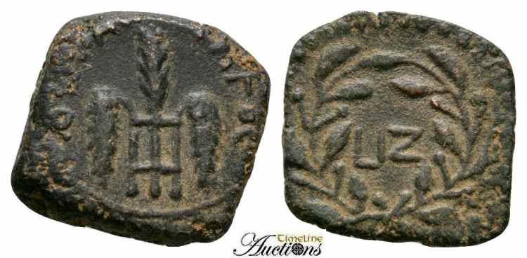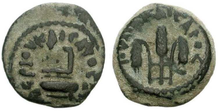 | Hendin 648 | Judaea, Roman Procurators, Pontius Pilate AE Prutah. Dated Year 16 of Tiberius = AD 29-30 AD. IOVΛIAC KAICAΡOC, three grain ears bound together / TIBEΡIOY KAICAΡOC LIς, simpulum. SNG ANS 367, AJC II 21; RPC I RPC I 4967; Hendin 648. | Text | Image | Text | Image |