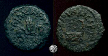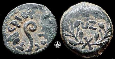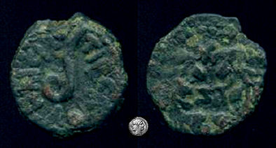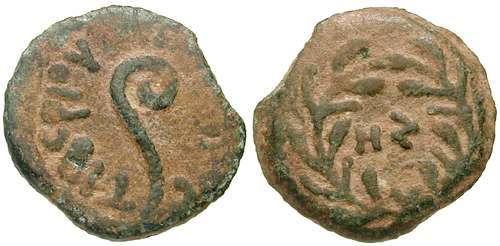 | Hendin 649a | Pontius Pilate, procurator of Judea under Tiberius, 26-36 AD, bronze prutah of 14.7 mm, 2.05 grams. Struck in the year 29 or 30 AD. LIZ (date) within a wreath / Lituus. | Text | Image |