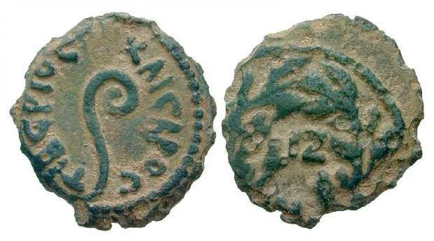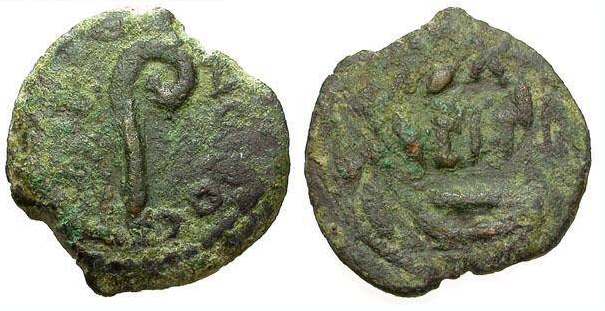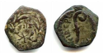 | lepton | Judaea, Pontus Pilate, procurator under Tiberius, AE lepton, (1.66g) TIBEΡOY KAICAΡ, Lituus / Wreath. | Text | Image | Text | Image |
