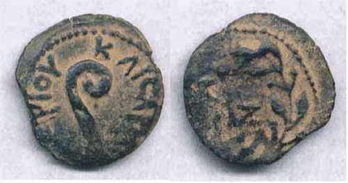 | Meshorer 331-333 mule | Judaea, Prutah Mule, 30 AD. Struck by Pontius Pilate under Tiberius. IOYΛIA KAICAΡOC, three bound grain ears / Date LIZ within wreath. Mule of Meshorer 331; Hendin 1341; RPC I 4967 (obverse) and Meshorer 333; Hendin 1342; RPC 4968 (reverse). TimeLine Auctions int. no. 110707. | Text | Image |