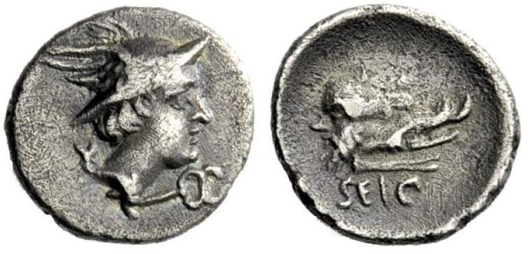 | SNG ANS 115 | Signia, Latium (central Italy), AR obol or hemilitron. ca 280-275. 0.69 g. Head of Hermes (Mercury) right, wearing winged petatos, caduceus before head, dolphin on neck / SEIC beneath mask composed of the head of Silenus left and a boar's head right. BMC 1; Sambon 164; SNG ANS 115; Rutter HN Italy 343. | Text | Image |