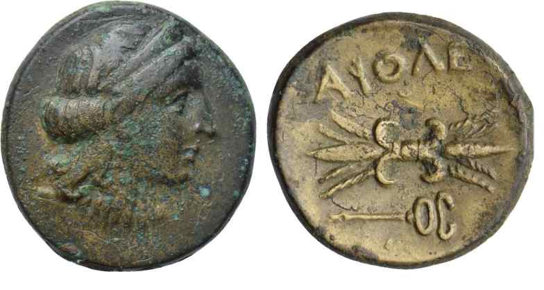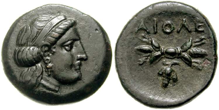 BMC 2 | Lesbos, Methymna(?) AE 17mm. Circa 4th Century BC. Female head right, in stephane, earring and necklace / AIOΛE, thunderbolt; grapes below.