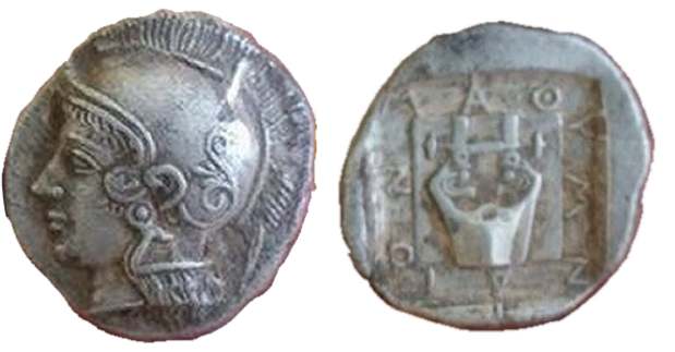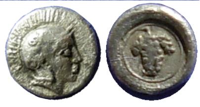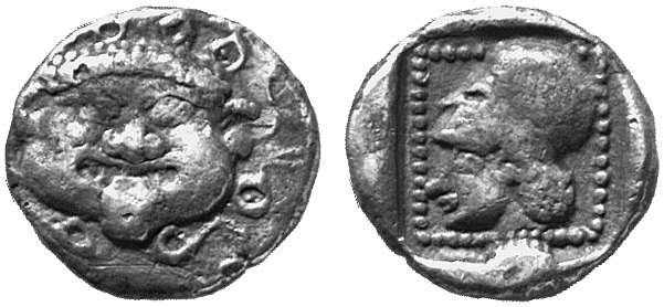 Traite 21 | Methymna AR Diobol ca 500-450 BC. 1.35g. Facing head of Gorgoneion, tongue protruding / Head of Athena left, wearing Corinthian helmet, within dotted incuse square. Traite Pl. 15, 21; Franke, Methymna 5. | Text |  |