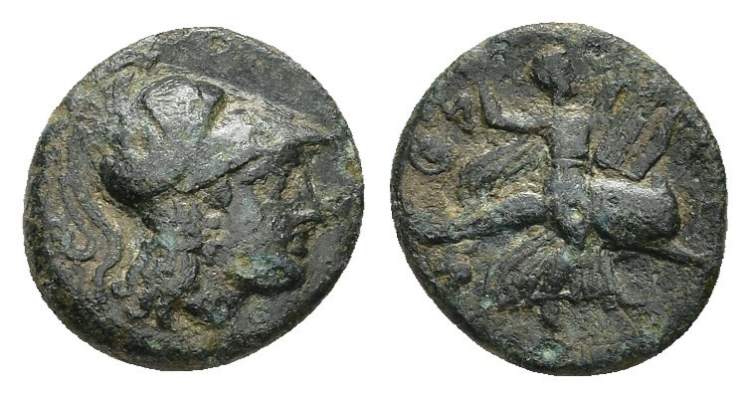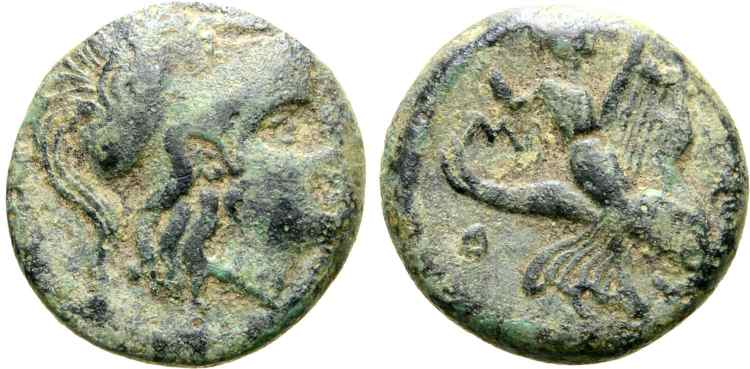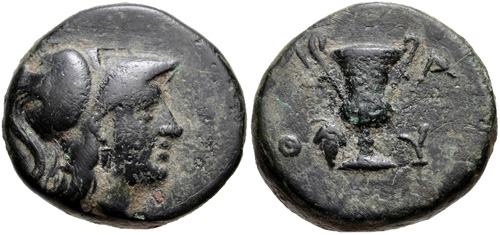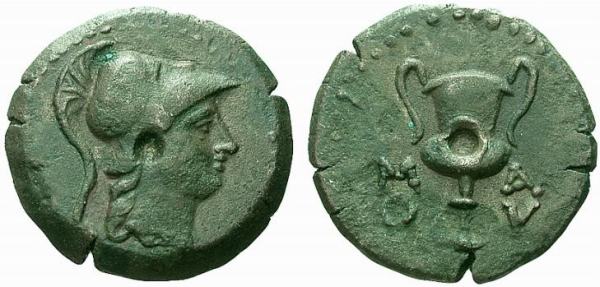 SNG vA 1743 | Methymna AE17, 2nd-1st cent BC. 3.31g. Head of Athena right, wearing crested Corinthian helmet / MAΘY, kantharos. SNG von Aulock 1743; SNG München 714; Franke 25. | Text |  |