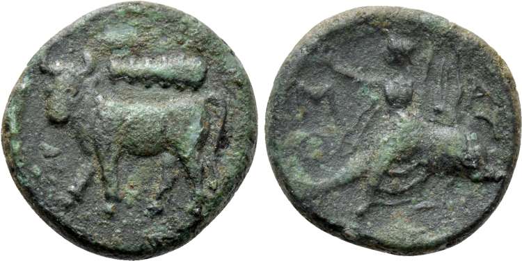 BMC 27 | Methymna, Lesbos, AE12 civic issues. 167-1 BC. 1.95 g. Bull standing left; club above. / MAΘY, Arion, holding lyre, astride dolphin right. BMC 27; Franke Methymna 28. | Text |  |
