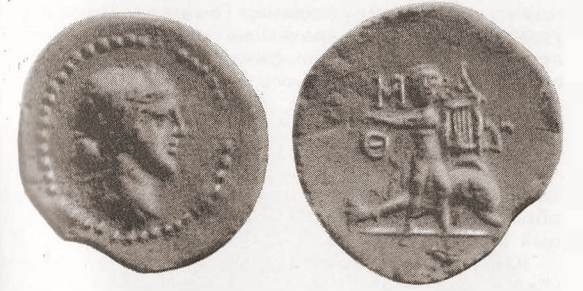 BMC 35 | Methymna, Lesbos, AE24, 2nd-1st C. BC. Laureate head of Apollo right / M-A Θ-Y in two lines across fields, Arion, wearing long chiton and chlamys, sitting facing on dolphin right, holding lyre in left hand and extending right hand. BMC 35; Franke Methymna 24A; BERLIN 28723; SNG Cop 361; Imhoof 2. | Text |  |