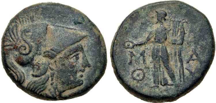 Franke 19A | Methymna, Lesbos, AE11, after 200 BC. Helmeted head of Athena left / MA-ΘY across fields, lyre; crested helmet at upper left. Franke 19A; SNG Cop 353. | Text |  |