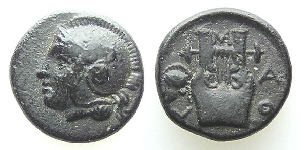 Franke 25A | Methymna, Lesbos, AE10 civic issue. 200-10 BC. 1.86 g. Helmeted head of Athena right. / M-A Θ-Y in two lines across fields, kantharos, thunderbolt or horizontal corn ear above. Franke Methymna 25A. | Text |  |