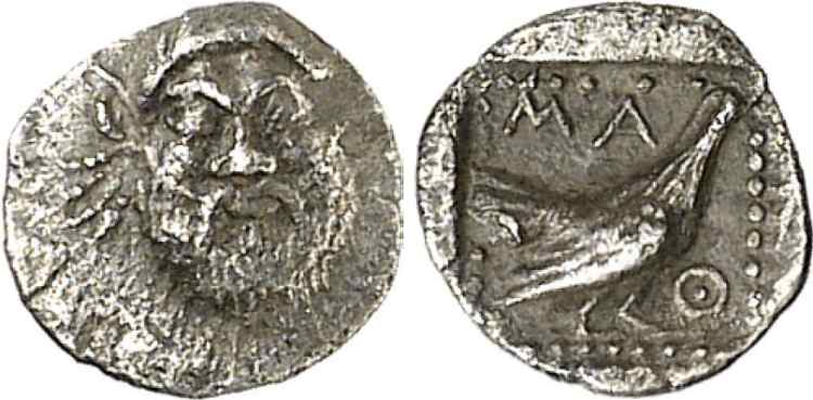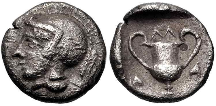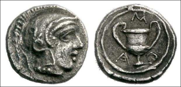 Klein 351 | Methymna, Lesbos, AR Obol. 0.55 gr. 420-377 BC. Helmeted head of Athena right / MAΘ, Kantharos within lined circle. Klein 351; cf BMC 11 (with MΘA). | Text |  |