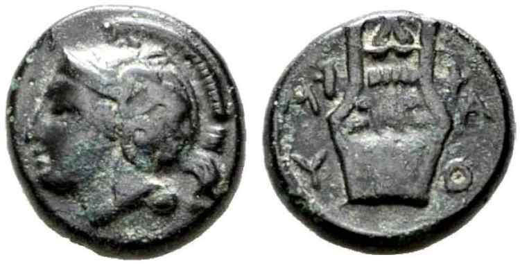 Franke 22E | Methymna, Lesbos, AE11. Civic issue, 350-240 BC. 1.54 g. Helmeted head of Athena right. / M-A Θ-Y to left and right of kantharos, star above. Franke Methymna 22E; Berlin 1914.1316. | Text |  |