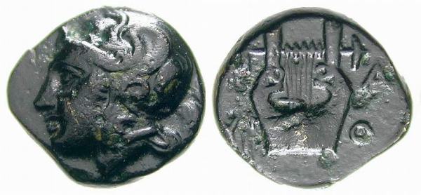 Franke 21 | Methymna AE, after 330 BC. 0.73g. Head of Athena left / M-A Θ-Y, 4-string lyre. Franke Methymna 21. | Text |  |