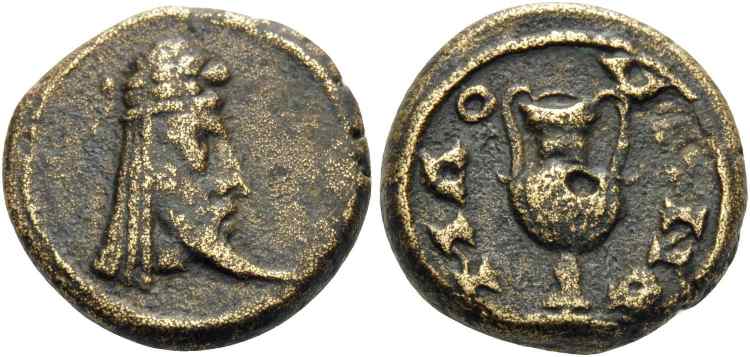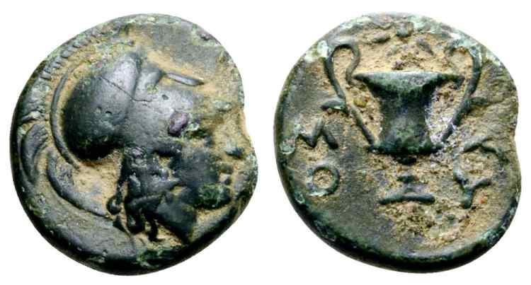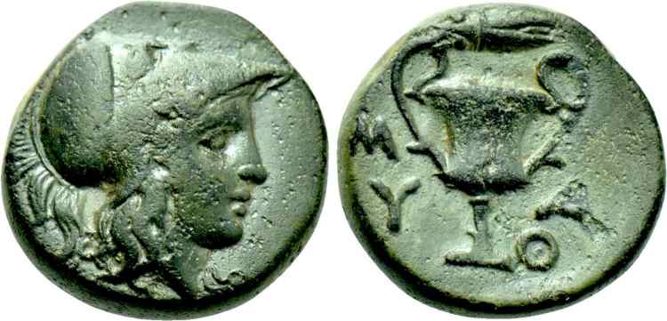 M & M 27, 2105 | Methymna, Lesbos. AE21, civic issue, 200-10 BC. 4.02 g. Helmeted head of Athena right. / M-A Θ-Y to left and right of kantharos, small oinochoe in lower right field. Apparently unpublished with this symbol. M&M 27, 2105. | Text |  |