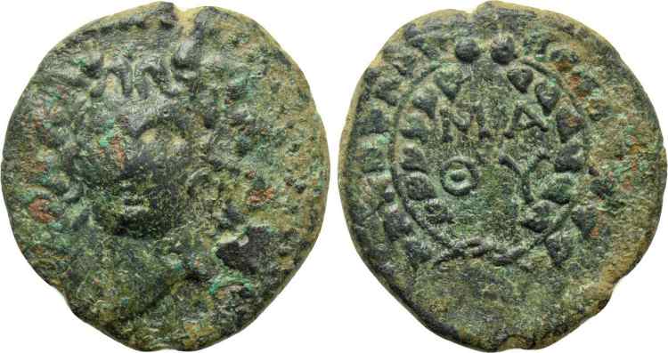 Franke 31A | Methymna, Lesbos. AE21, civic issue, 167-100 BC. 5.44 g. Facing head of Dionysos, wreathed with ivy. / MA-ΘY in two lines within wreath. Franke Methymna 31A-31D; SNG Cop 362; SNG Munich 716; Mionnet III 53; Hoover HGC 912. | Text |  |