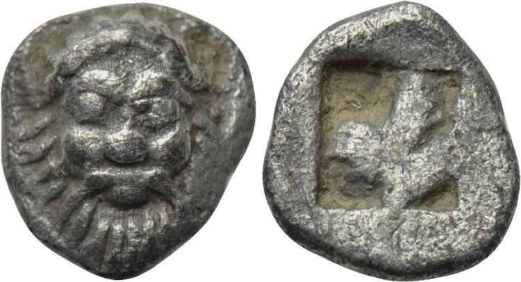 Gokturk 51 | Methymna, Lesbos. AR Tetartemorion, 6 mm, 0.29 g. ca 480-460 BC. Facing head of Silenos. / Quadripartite incuse square. Göktürk 51 in Anadolu Vol. 1998; Anatolian Museum inv. 149.2.1.95. | Text |  |