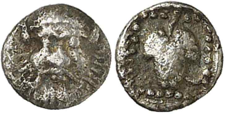 Gokturk 52 | Methymna, Lesbos. AR Tetartemorion, 6 mm, 0.25 g. ca 480-460 BC. Facing head of Silenos./ Bunch of grapes in dotted square. Göktürk 52 in Anadolu Vol. 1998; Anatolian Museum inv. 120.30.4.95. | Text |  |