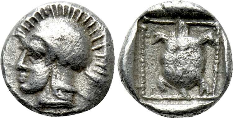 Gokturk 53 | Methymna, Lesbos, AR obol, ca 500-460 BC. 8 mm, 0.3 g. Helmeted head of Athena left. / Tortoise within dotted square, all within incuse square. Hoover HGC (Islands) 890; Gokturk 53 in Anadolu 1998; Gokturk 64 in Anadolu 1994. | Text |  |