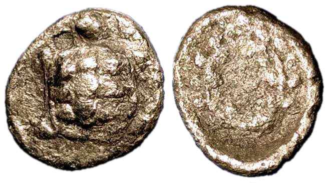 SNG Kayhan 96 | Methymna, Lesbos, AR hemiobol or 1/48th stater, ca. 400 BC. 7 mm, 0.36 g. Turtle seen from above / Wreath. SNG Kayhan 96; Mueller Coll. 603. | Text |  |