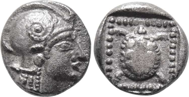 Klein 793 | Methymna, Lesbos, AR obol, ca 500-460 BC. 8 mm, 0.55 g. Helmeted head of Athena right. / Tortoise within dotted square, all within incuse square. Klein 793; Traité II 2255; Hoover HGC (Islands) 891; Imhoof Miszellen II, 65; Warren 1225 ("Lycia"). | Text |  |
