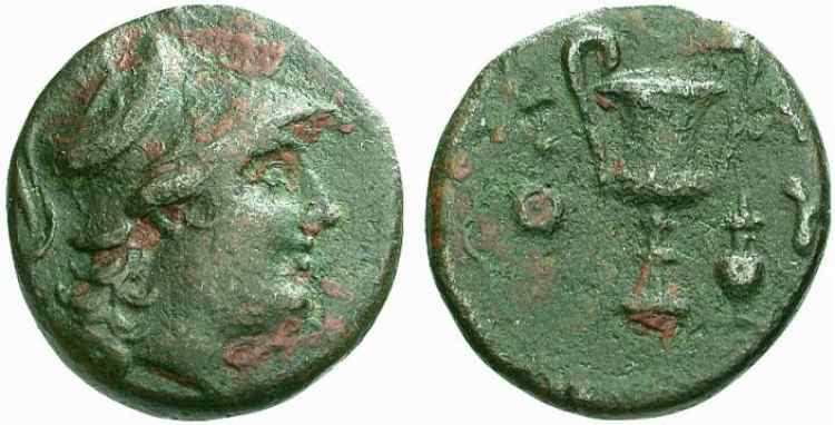 Franke 30 | Methymna, Lesbos, AE15, civic issue. 167-1 BC. 3.71 g. Bearded head of Dionysos Phallenos right, with long, pointed beard and hair in formal locks, wearing Phrygian cap. / MAΘYMNA, kantharos. Franke Methymna 30; Waddington 1379. | Text |  |