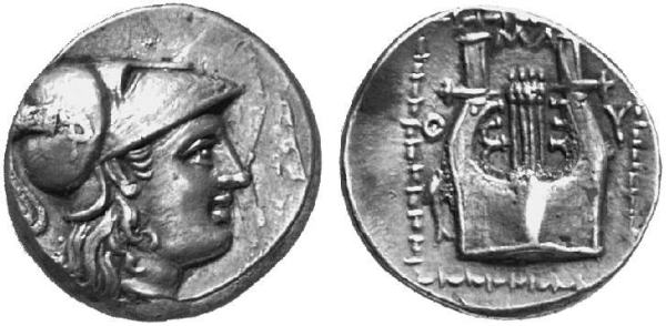 SNG Cop 352 | Methymna AR Triobol ca 330-280 BC. 2.92g. Head of Athena right, wearing crested Corinthian helmet with coiled serpent / MA-ΘY, kithara (lyre) with four strings, dolphin to left. SNG Cop 352; Franke 13. | Text |  |