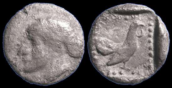 Schoenert, Dikaia 21f | Methymna, Lesbos, AR Tritemorion or hemiobol, 7 mm, 0.29 g. 400 BC. Head of nymph left, wearing sakkos and earring / Rooster standing right in dotted square all within incuse square. Schoenert-Geiss, Dikaia 21f; SNG Turkey 9, 476. | Text |  |