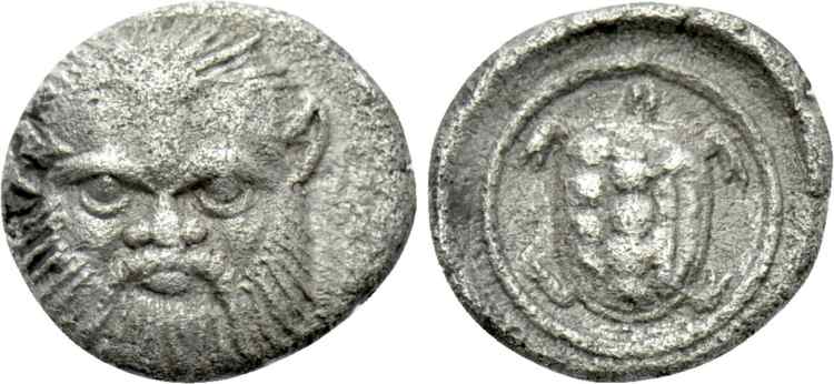G&M 196, 1632 | Methymna, Lesbos, AR hemiobol. ca 400 BC. 8 mm, 0.38 g. Bearded head of Silenos facing. / Tortoise in dotted square frame. Unpublished with square frame but several known. Aufhäuser 14, 127; Lanz 117, 112; G & M 196, 1632 (this example). See Traité 2263 below for the same type but in circular frame. | Text |  |