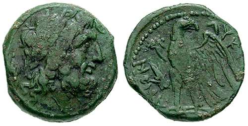 | SNG ANS 4 | Lucania, The Lucani. Circa 207-204 BC. AE 20mm, Unit. Laureate head of Zeus right; spearhead / Eagle left; head of wolf. Rutter HN 1457. | Text | Image |