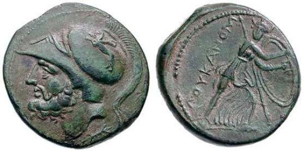 | Scheu 1 | Lucania, The Lucani. ca 210-203 BC. AE Reduced Sextans. Helmeted head of Ares left in crested Corinthian helmet decorated with a griffin / ΛOYKANOM right, Nike standing left, placing wreath on a trophy. | Text | Image |