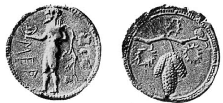 | BMC 1 | Possibly the Serdiai, Sybaris, Lucania. AR didrachm. 7.95 g. MEΡ (ΣEΡ retrograde with sideways Σ?), Dionysos, naked, standing left, holding kantharos and long vine with bunches of grapes. / Bunch of grapes with a wreath to left and right. BMC Italy ("Ser.."), 1; de Luynes 1138; Traite II-1, 2222 ("Sergention"); Bernhart 651 ("uncertain in Bruttium"). | Text | Image |