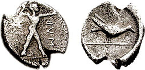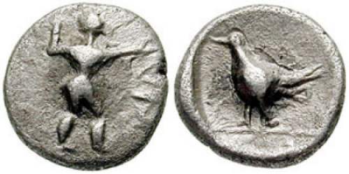 | SNG ANS 860 | Lucania, Sybaris. Circa 453-448 BC. AR Triobol (1.39 g). BVM (retrograde) to right of Poseidon walking right, wielding trident overhead in right hand, left hand extended / Bird standing right. (possibly a dove). BMC | Text | Image | Text | Image |